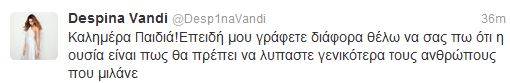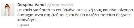 Η Δέσποινα Βανδή με ένα σκληρό μήνυμα στο twitter μιλάει για κακία και δυστυχισμένες ψυχές…Πριν από λίγα λεπτά ανέβασε δύο tweets για τους followers της.Διαβάστε τι έγραψε…