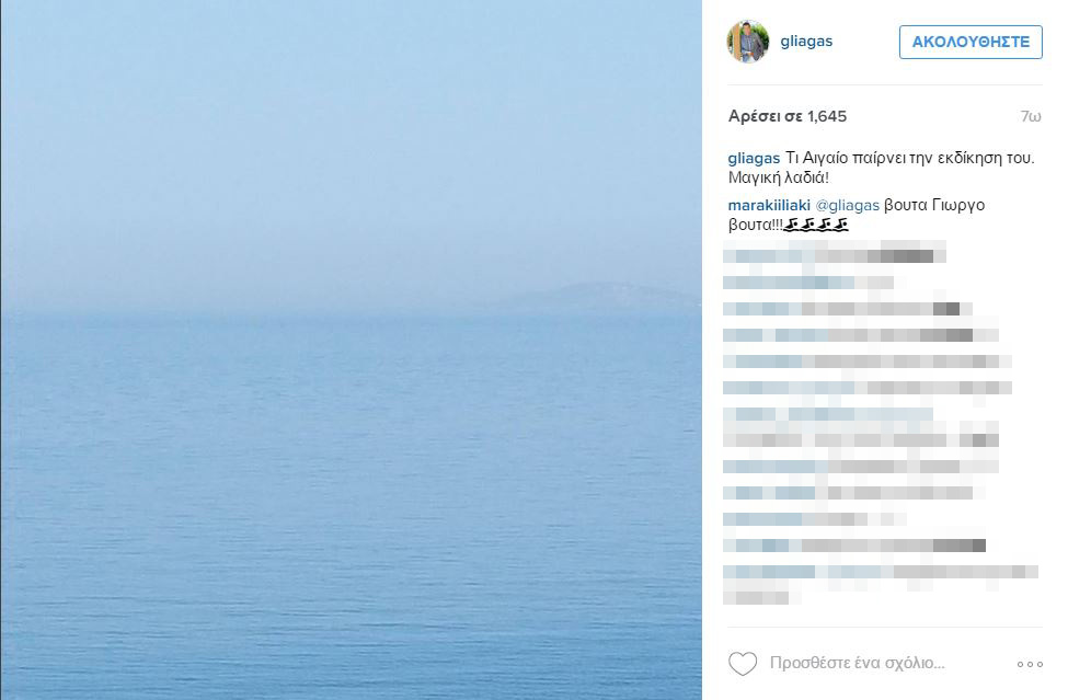 Σε φωτογραφία που ανήρτησε ο παρουσιαστής από την Τήνο με το σχόλιο «Το Αιγαίο παίρνει την εκδίκησή του. Μαγική λαδιά», η Μαρία Ηλιάκη του έγραψε «Βούτα, Γιώργο, βούτα!».