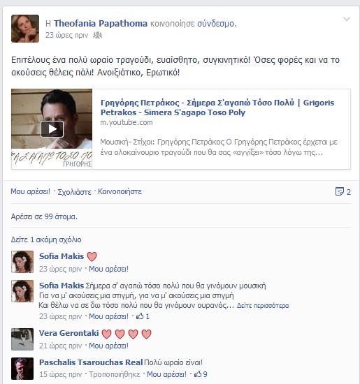 Η Θεοφανία Παπαθωμά ανέβασε στο προφίλ της στο facebook το τραγούδι του συντρόφου της, Γρηγόρη Πετράκου.
