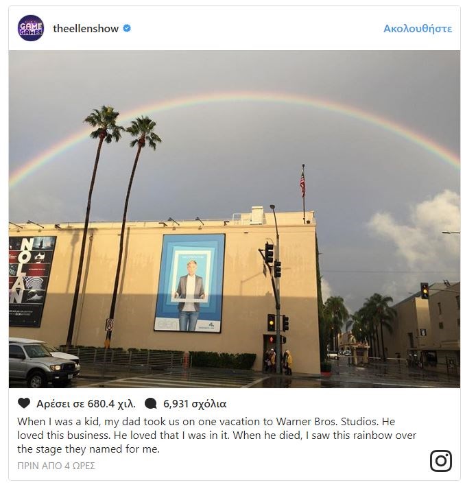 Στην απώλεια του αγαπημένου της πατέρα αναφέρθηκε η δημοφιλής Αμερικανίδα παρουσιάστρια Έλεν ΝτιΤζένερις. «Έχασα τον πατέρα μου αυτή την εβδομάδα. Ήταν 92 ετών. Είχε μια καλή, μεγάλη ζωή», είπε στον «αέρα» της εκπομπής της και προσέθεσε: «δεν ήταν ένα γεγονός ξαφνικό. Κατάφερα να τον αποχαιρετίσω. Όταν ήμουν παιδί, ο πατέρας μου μας πήγαινε διακοπές, ερχόταν εδώ, στα στούντιο της Warner. Λάτρευε τη showbiz. Λάτρευε που ήμουν μέρος της».«Ήταν πολύ ευγενικός, αποδεχόταν τους άλλους, δεν είχε μέσα του ούτε ίχνος επικριτικότητας. Λίγο πριν πεθάνει, έφτασα εδώ στα στούντιο, κοίταξα έξω πάνω από μια αφίσα μου και είδα αυτό το ουράνιο τόξο», είπε εμφανώς συγκινημένη.Δείτε το βίντεο: