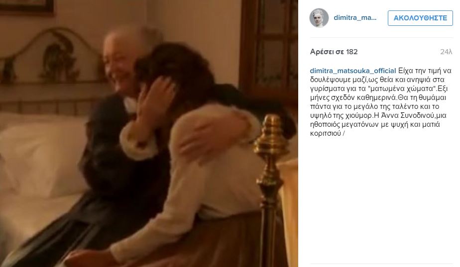 Η Δήμητρα Ματσούκα συνεργάστηκε με την Άννα Συνοδινού στα «Ματωμένα Χώματα». Μέσω του προσωπικού της λογαριασμού στο Instagram αποχαιρέτισε τη μεγάλη ηθοποιό που «έφυγε» σήμερα από τη ζωή.
