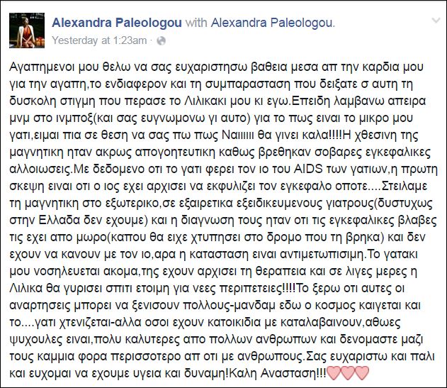 Η Αλεξάνδρα Παλαιολόγου, θέλοντας να ευχαριστήσει τον κόσμο που τις συμπαραστέκεται και της δείχνει την αγάπη του έγραψε: «Αγαπημένοι μου θέλω να σας ευχαριστήσω βαθιά μέσα απ την κάρδια μου για την αγάπη, το ενδιαφέρον και τη συμπαράσταση που δείξατε σ αυτή τη δύσκολη στιγμή που πέρασε το Λιλικάκι μου κι εγώ. Επειδή λαμβάνω άπειρα μηνύματα στο ινμποξ (και σας ευγνωμονώ γι αυτό) για το πώς είναι το μικρό μου γατί, είμαι πια σε θέση να σας πω πως Ναιιιιιι θα γίνει καλά !!!!Η χθεσινή της μαγνητική ήταν άκρως απογοητευτική καθώς βρεθήκαν σοβαρές εγκεφαλικές αλλοιώσεις. Με δεδομένο ότι το γατί φέρει τον ιό του AIDS των γατιών, η πρώτη σκέψη είναι ότι ο ιός έχει αρχίσει να εκφυλίζει τον εγκέφαλο οπότε ….Στείλαμε τη μαγνητική στο εξωτερικό, σε εξαιρετικά εξειδικευμένους γιατρούς (δυστυχώς στην Ελλάδα δεν έχουμε) και η διάγνωση τους ήταν ότι τις εγκεφαλικές βλάβες τις έχει από μωρό (κάπου θα είχε χτυπήσει στο δρόμο που τη βρήκα) και δεν έχουν να κάνουν με τον ιό, άρα η κατάσταση είναι αντιμετωπίσιμη. Το γατάκι μου νοσηλεύεται ακόμα, της έχουν αρχίσει τη θεραπεία και σε λίγες μέρες η Λιλίκα θα γυρίσει σπίτι έτοιμη για νέες περιπέτειες !!!!Το ξέρω ότι αυτές οι αναρτήσεις μπορεί να ξενίσουν πολλούς-μαντάμ εδώ ο κόσμος καίγεται και το….γατί χτενίζεται-αλλά όσοι έχουν κατοικίδια με καταλαβαίνουν, αθώες ψυχούλες είναι, πολύ καλύτερες από πολλών ανθρώπων και δενόμαστε μαζί τους καμιά φορά περισσότερο απ ότι με ανθρώπους. Σας ευχαριστώ και πάλι και εύχομαι να έχουμε υγεία και δύναμη! Καλή Ανάσταση!!!»