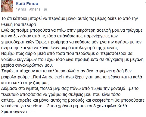 Ωστόσο, υπάρχουν κι εκείνοι που περνούν μόνοι τους  αυτές τις ημέρες. Σε αυτή λοιπόν, την κατηγορία ανθρώπων θέλησε να στείλει ένα μήνυμα η Καίτη Φίνου γράφοντας στο Facebook: