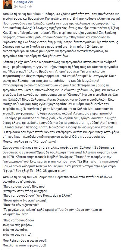 Με αφορμή την συμπλήρωση 36 ετών από το θάνατο του Νίκου Ξυλούρη, η ηθοποιός Γεωργία Ζώη έγραψε ένα ιδιαίτερα συγκινητικό κείμενο στην προσωπική της σελίδα στο Facebook για τον μεγάλο Κρητικό καλλιτέχνη και αναφέρθηκε σε ένα παιχνίδι της μοίρας. Ποιο ήταν αυτό; Όταν ήταν ακόμη φοιτήτρια της Αρχιτεκτονικής γνώρισε τον Ξυλούρη, ο οποίος εντυπωσιάστηκε από τη φωνή της. Θα συμμετείχαν μαζί σε μια περιοδεία, αλλά δεν έγινε ποτέ, καθώς την απαγόρευσε η χούντα. Από τότε συναντήθηκαν πολλές φορές και όλο έλεγαν να δουλέψουν μαζί, κάτι που τελικά δεν κατάφεραν, αφού ο Ψαρονίκος έφυγε μόλις σε ηλικία 43 ετών.