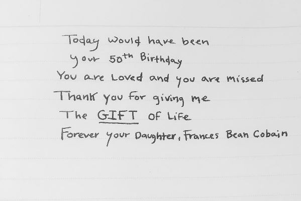 Η κόρη του Κερτ Κομπέιν, Φράνσις Μπιν Κομπέιν, ανέβασε στο Instagram ένα συγκινητικό μήνυμα για τον πατέρα της που έχει φύγει από τη ζωή.«Σήμερα, θα γινόσουν 50 ετών. Έχεις αγαπηθεί και λείπεις. Σε ευχαριστώ που μου έδωσες το δώρο της ζωής. Για πάντα, η κόρη σου, Φράνσις Μπιν Κομπέιν» έγραψε η κόρη του Κερτ Κομπέιν.