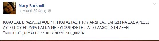 ( Καλό σας βράδυ. Σταθερή η κατάσταση του Ανδρέα. Ελπίζω να σας αρέσει αυτό που έγραψα και να με σε συγχωρήσετε για το λάθος στη λέξεη “μπορεί”. Είμαι πολύ κουρασμένη. Φιλιά).