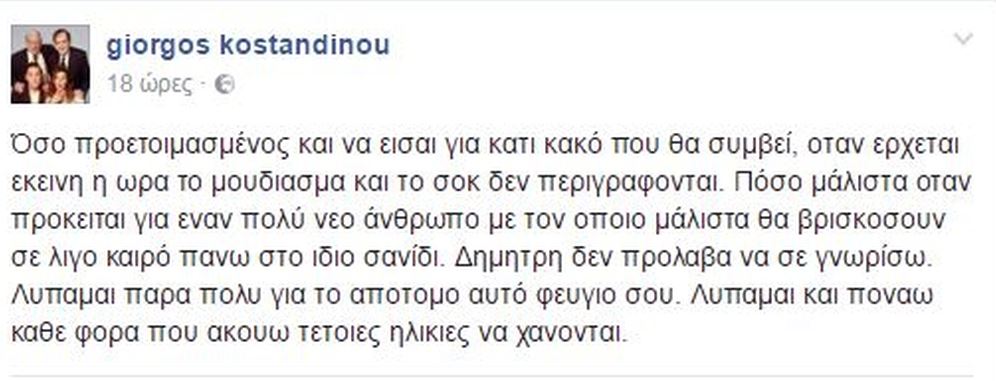 «Όσο προετοιμασμένος και να είσαι για κάτι κακό που θα συμβεί, όταν έρχεται εκείνη η ώρα το μούδιασμα και το σοκ δεν περιγράφονται. Πόσο μάλιστα όταν πρόκειται για έναν πολύ νέο άνθρωπο με τον οποίο μάλιστα θα βρισκόσουν σε λίγο καιρό πάνω στο ίδιο σανίδι. Δημήτρη δεν πρόλαβα να σε γνωρίσω. Λυπάμαι πάρα πολύ για το απότομο αυτό φευγιό σου. Λυπάμαι και πονάω κάθε φορά που ακούω τέτοιες ηλικίες να χάνονται» έγραψε στο facebook ο Γιώργος Κωνσταντίνου.