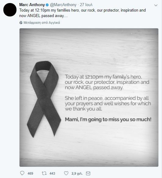 Δύσκολες ώρες περνά ο διάσημος τραγουδιστής Μαρκ Άντονι, καθώς έχασε τη μητέρα του, Guillermina Quiñones.