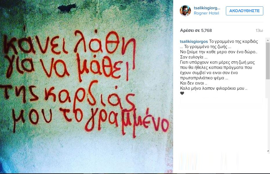 Ο Γιώργος Τσαλίκης έγραψε χαρακτηριστικά κάτω από τη φωτογραφία: «Το γραμμένο της καρδιάς … Το γραμμένο της ζωής …Να ζούμε την κάθε μέρα σαν ένα δώρο.. Σαν ευλογία …Γιατί υπάρχουν κάτι μέρες στη ζωή μας που θα ήθελες κάποια πράγματα που έχουν συμβεί να είναι σαν ένα πρωταπριλιάτικο ψέμα …Και δεν είναι ..Καλό μήνα λοιπόν φιλαράκια μου ..».