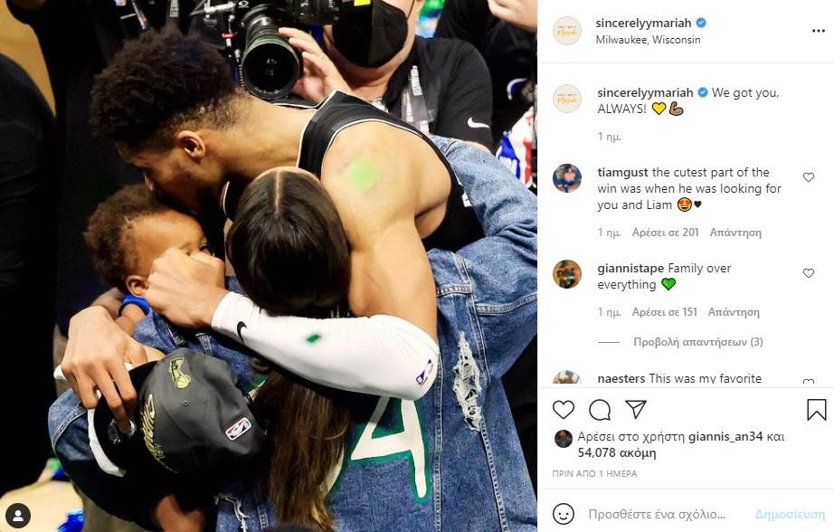 “Κανείς δεν ξέρει πραγματικά τη σκληρή δουλειά που έκανες και τα εμπόδια που έπρεπε να ξεπεράσεις, αλλά να δω μέρος του ταξιδιού σου ήταν μεγάλη ευλογία. Είμαι πολύ περήφανη για σένα μωρό μου. Είσαι πρωταθλητής του NBA και κανείς δεν μπορεί να στο πάρει αυτό. Αγαπώ όλα όσα είσαι. Τώρα πάμε να κάνουμε αυτό το παιδί”, έγραψε κάτω από μια φωτογραφία με τον Γιάννη αγκαλιά με τα χρυσά τρόπαια μιας άκρως επιτυχημένης σεζόν.