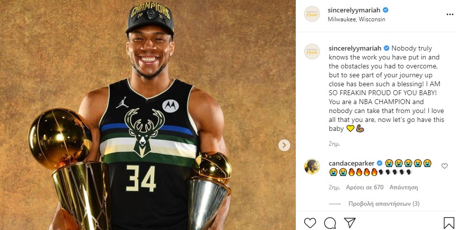Μετά την κατάκτηση του πρωταθλήματος του NBA από τους Bucks και την φρενίτιδα χαράς που βιώνει αυτές τις μέρες ο super star του παγκόσμιου basket, Γιάννης Αντετοκούνμπο, η σύντροφός του Mariah Riddlesprigger, έκανε μια τρυφερή ανάρτηση στον προσωπικό της λογαριασμό στο instagram, μιλώντας για την σπουδαία νίκη του δικού μας Γιάννη.