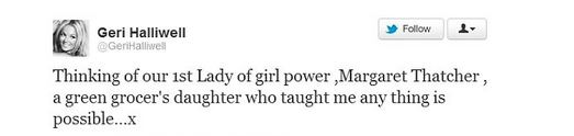Το πρώην μέλος του συγκροτήματος των Spice Girls, Τζέρι Χάλιγουελ, προκάλεσε αντιδράσεις με το tweet της που αναφερόταν στον θάνατο της Μάργκαρετ Θάτσερ.