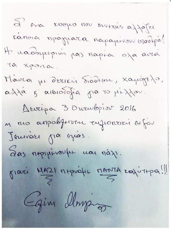 «Σ’ ένα κόσμο που συνεχώς αλλάζει κάποια πράγματα παραμένουν σταθερά! Η καθημερινή μας παρέα όλα αυτά τα χρόνια. Πάντα με θετική διάθεση, χαμόγελο, αλλά και αισιοδοξία για το μέλλον. Δευτέρα 3 Οκτωβρίου 2016 η πιο απρόβλεπτη τηλεοπτική σεζόν ξεκινάει για εμάς. Σας περιμένουμε και πάλι. Γιατί ΜΑΖΙ περνάμε ΠΑΝΤΑ καλύτερα!!! Ελένη Μενέγακη».