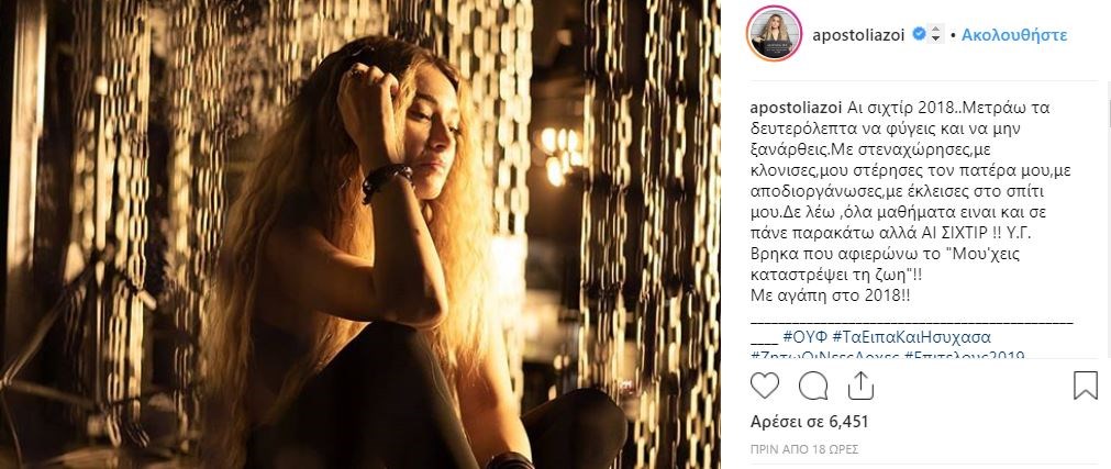 Η Αποστολία Ζώη ανέβασε μία φωτογραφία της στον προσωπικό της λογαριασμό στο Instagram, την οποία και συνόδευσε με το σχόλιο: “Αι σιχτίρ 2018..Μετράω τα δευτερόλεπτα να φύγεις και να μην ξανάρθεις. Με στεναχώρησες, με κλόνισες, μου στέρησες τον πατέρα μου, με αποδιοργάνωσες, με έκλεισες στο σπίτι μου. Δεν λέω ,όλα μαθήματα είναι και σε πάνε παρακάτω αλλά ΑΙ ΣΙΧΤΙΡ !! Υ.Γ. Βρήκα που αφιερώνω το “Μου’χεις καταστρέψει τη ζωή”. Με αγάπη στο 2018.”