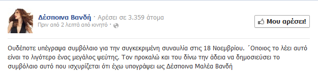 “Ουδέποτε υπέγραψα συμβόλαιο για την συγκεκριμένη συναυλία στις 18 Νοεμβρίου. Όποιος το λέει αυτό είναι το λιγότερο ένας μεγάλος ψεύτης. Τον προκαλώ και του δίνω άδεια να δημοσιεύσει το συμβόλαιο αυτό που ισχυρίζεται ότι έχω υπογράψει ως Δέσποινα Μαλέα Βανδή”.