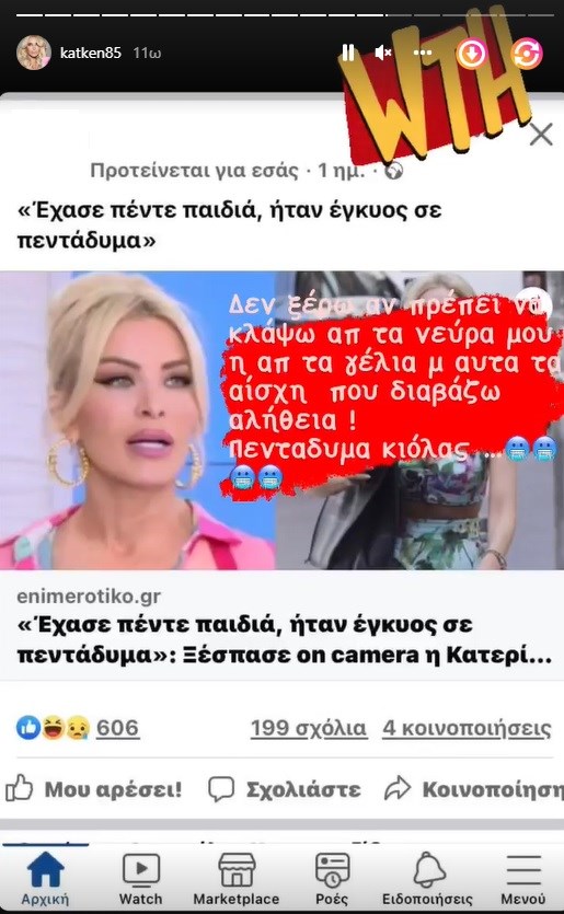 «Δεν ξέρω αν πρέπει να κλάψω απ’ τα νεύρα μου ή απ’ τα γέλια με αυτά τα αίσχη που διαβάζω, αλήθεια», έγραψε στο instagram η Κατερίνα Καινούργιου και σε άλλο instastory σημείωσε: «Και να μην παρεξηγηθώ, ο τίτλος αυτός ήταν εξώφυλλο θλιβερής φυλλάδας που κυκλοφορούσε το καλοκαίρι».