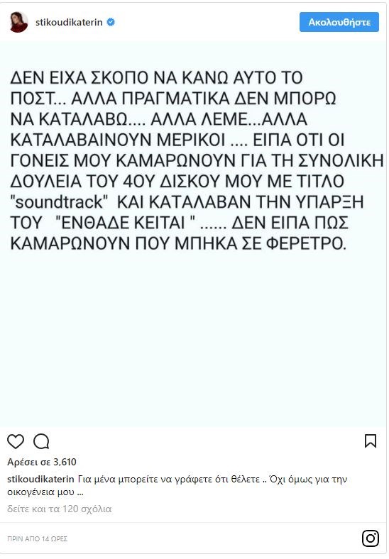 Δίπλα από την ανάρτησή της, έγραψε: “Για ‘μένα μπορείτε να γράφετε ό,τι θέλετε.. Όχι όμως για την οικογένειά μου…”
