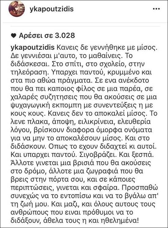 Ο Γιώργος Καπουτζίδης με αφορμή την τραγωδία στο Ορλάντο, έστειλε το δικό του μήνυμα κατά της ομοφοβίας, μέσω του προσωπικού του λογαριασμού στο Ιnstagram.
