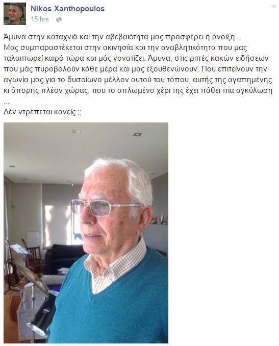 Μαζί με μια πρόσφατη φωτογραφία του στο facebook, ο ηθοποιός δημοσίευσε και τις σκέψεις του: “Άμυνα στην καταχνιά και την αβεβαιότητα μας προσφέρει η άνοιξη ..Μας συμπαραστέκεται στην ακινησία και την αναβλητικότητα που μας ταλαιπωρεί καιρό τώρα και μας γονατίζει. Άμυνα, στις ριπές κακών ειδήσεων που μάς πυροβολούν κάθε μέρα και μας εξουθενώνουν. Που επιτείνουν την αγωνία μας για το δυσοίωνο μέλλον αυτού του τόπου, αυτής της αγαπημένης κι άπορης πλέον χώρας, που το απλωμένο χέρι της έχει πάθει πια αγκύλωση …Δεν ντρέπεται κανείς;”.