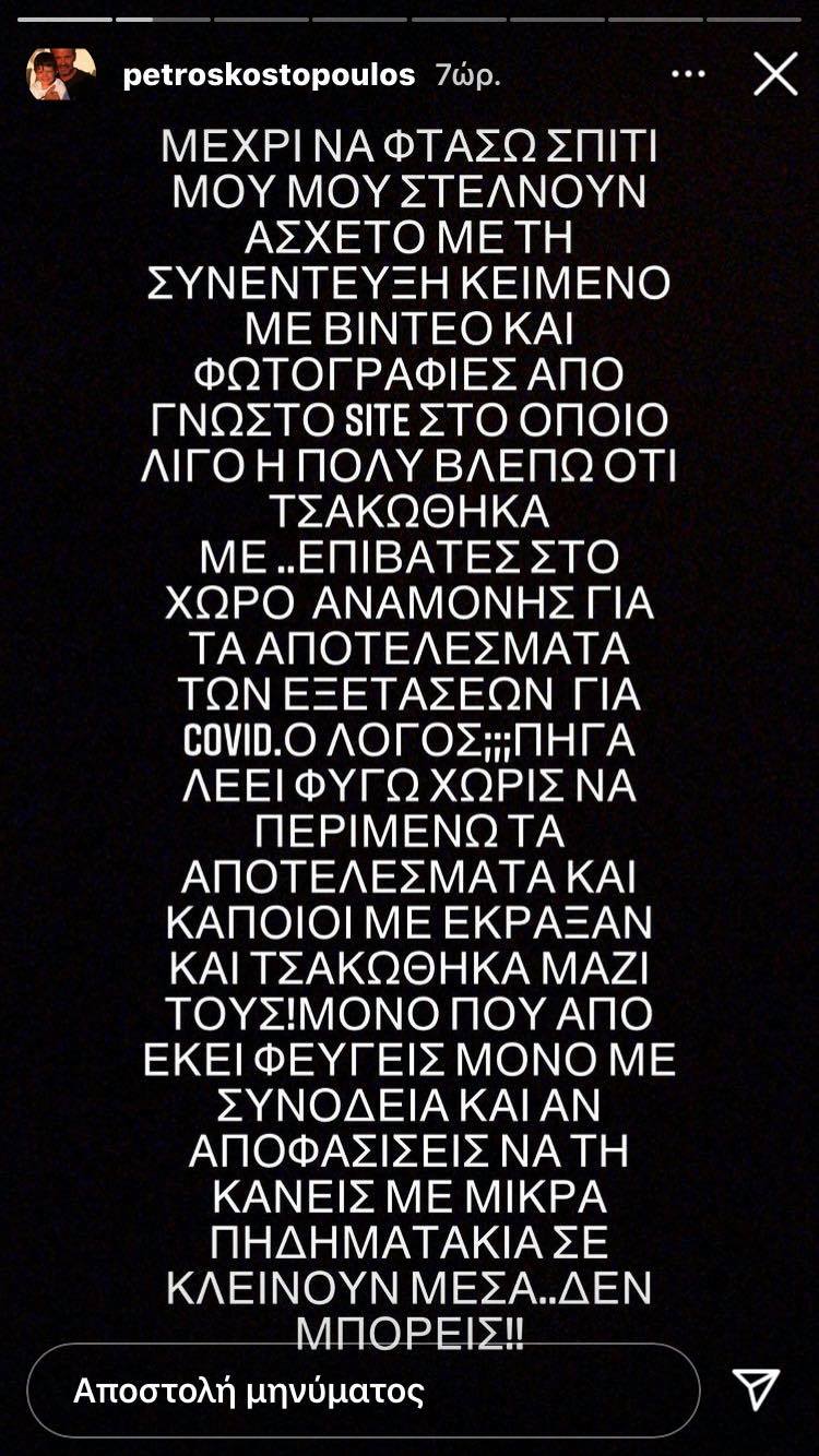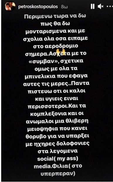 “Δεν συνηθίζω να απαντώ στο instagram για προσωπικές μου υποθέσεις. Όμως αισθάνομαι ότι το ποτήρι έχει ξεχειλίσει και ο ρόλος του καρπαζοεισπράκτορας μου κάθεται στραβά. Λοιπόν σήμερα έφτασα από το περιβόητο Ντουμπάι και βρέθηκα απέναντι στις περισσότερες κάμερες και παπαράτσι που έχω συναντήσει στη ζωή μου. Δείγμα αν μη τι άλλο ειδησεογραφικής ενδιάμεσα στην κατάσταση που περνάμε. Είπα ότι είχα να πω μέσα σε ένα πολιτισμένο κλίμα, απαντώντας στις ερωτήσεις που με αφορούσαν. Γνωρίζοντας ότι θα τις δω αύριο σε διάφορες εκπομπές ανάλογα με το μοντάζ που θα διαλέξει ο κάθε αρχισυντάκτης. Και το καλό και το ουδέτερο και το κακό”, ανέφερε ο Πέτρος Κωστόπουλος στο πρώτο story του.