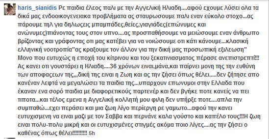 Ας κάνει οτι γουστάρει η Ηλιαδη…. 36 χρόνων ειναι, μάνα, και παίρνει μoνη της την ευθύνη των αποφάσεων της… δική της είναι η Ζωη και ας την ζήσει όπως θέλει….. δεν ζήτησε απο κανέναν λεφτά να μεγαλώσει τα παιδια της… παρχουν επώνυμοι στην Ελλάδα που έκαναν ενα σωρό παιδια με διαφορετικούς παρτενέρ και δεν βγήκε ποτε κανείς να πει τίποτα…και τέλος εμένα η Αγγελική κολλητή μου φίλη δεν υπήρξε πότε….απλά την συμπαθώ…εχει περάσει και μια ζωη λίγο περίεργη ρε γα… αφού την κάνει ευτυχισμενη να είναι μαζί με τον Σάββα και περνάνε καλά γούστο και καπέλο τους!!! Η ζωή είναι πολύ-πολύ μικρή και οι ευτυχισμένες στιγμές ακόμα ποιο λίγες….ας την ζήσει ο καθένας όπως θέλει!”