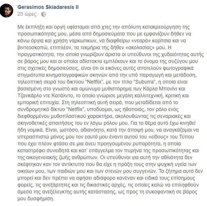 “Με έκπληξη και οργή υφίσταμαι από χτες την απόλυτη κατακρεούργηση της προσωπικότητάς μου, μέσα από δημοσιεύματα που με εμφανίζουν δήθεν να κάνω όργια και χρήση ναρκωτικών, να διαφθείρω «νεαρά» κορίτσια και να βιντεοσκοπώ, επιπλέον, τα τεκμήρια της δήθεν «ακολασίας» μου. Η πραγματικότητα, την οποία γνωρίζουν άριστα οι υπεύθυνοι της χυδαιότητας αυτής σε βάρος μου και οι οποίοι αδίστακτα εμπλέκουν και το όνομα της συζύγου μου στις σχετικές δημοσιεύσεις, είναι ότι οι εικόνες αυτές αποτελούν φωτογραφικά στιγμιότυπα κινηματογραφικών σκηνών από την υπό παραγωγή και μετάδοση, τηλεοπτική σειρά του δικτύου “Netflix”, με τον τίτλο “Suburra”, η οποία είναι βασισμένη στο γνωστό και ομώνυμο μυθιστόρημα των Κάρλο Μπονίνι και Τζανκάρλο ντε Κατάλντο, το οποίο γνώρισε μεγάλη καλλιτεχνική, κριτική και εμπορική επιτυχία. Στη τηλεοπτική αυτή σειρά, που μεταδίδεται από το συνδρομητικό δίκτυο “Netflix”, υποδύομαι, ως ηθοποιός, τον ρόλο ενός διεφθαρμένου μυθοπλαστικού χαρακτήρα, ακολουθώντας τις σεναριακές και σκηνοθετικές απαιτήσεις του εν λόγω ρόλου μου. Για το θέμα αυτό έχω κινηθεί ήδη νομικά. Είναι, ωστόσο, αδιανόητο, κατά την άποψή μου, να αναγκάζομαι να υπερασπιστώ μόνος μου τον εαυτό μου έναντι αυτού του «είδους» του Τύπου που έχει πλέον φτάσει σε μια άνευ προηγουμένου ρυπαρότητα, η οποία καταστρέφει συνειδητά και κατ’ επάγγελμα τον πυρήνα της προσωπικότητας και της οικογενειακής ζωής ανθρώπων. Οι υπεύθυνοι για αυτή την αθλιότητα δεν σκέφτηκαν καν τον αντίκτυπο που θα είχε η πράξη τους στην ψυχική υγεία των οικείων μου, των παιδιών μου και των στενών μου συγγενών. Το ζήτημα αυτό δεν μπορεί και δεν πρέπει να αφήσει αδιάφορο κανέναν και ειδικά τους επίσημους φορείς, τις ανεξάρτητες και τις δικαστικές αρχές, τις οποίες καλώ να επιληφθούν άμεσα της ανεξέλεγκτης αυτής κατάστασης, ως προς τη συκοφαντική σε βάρος μου δυσφήμιση”.