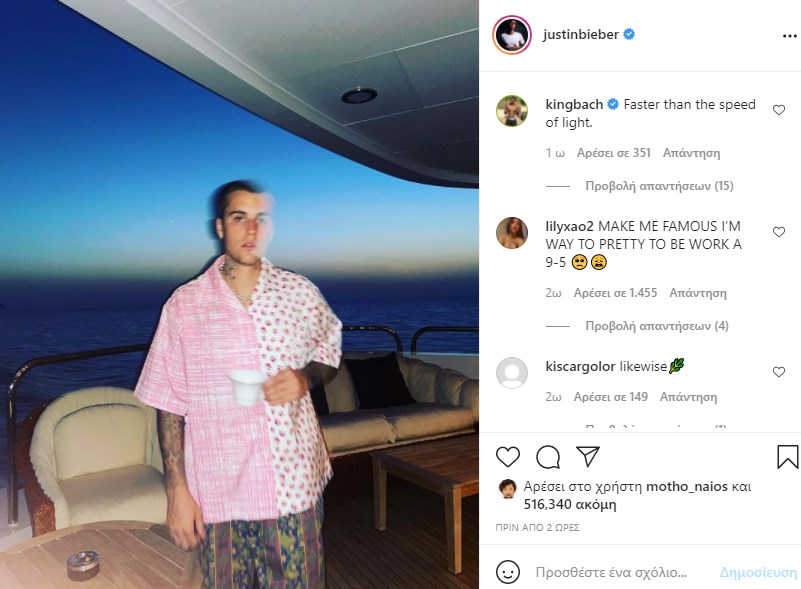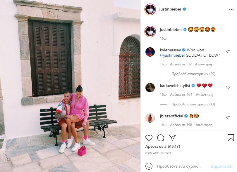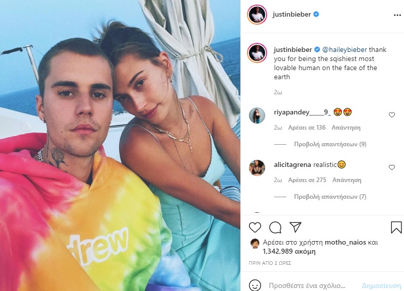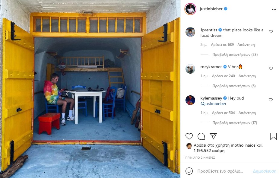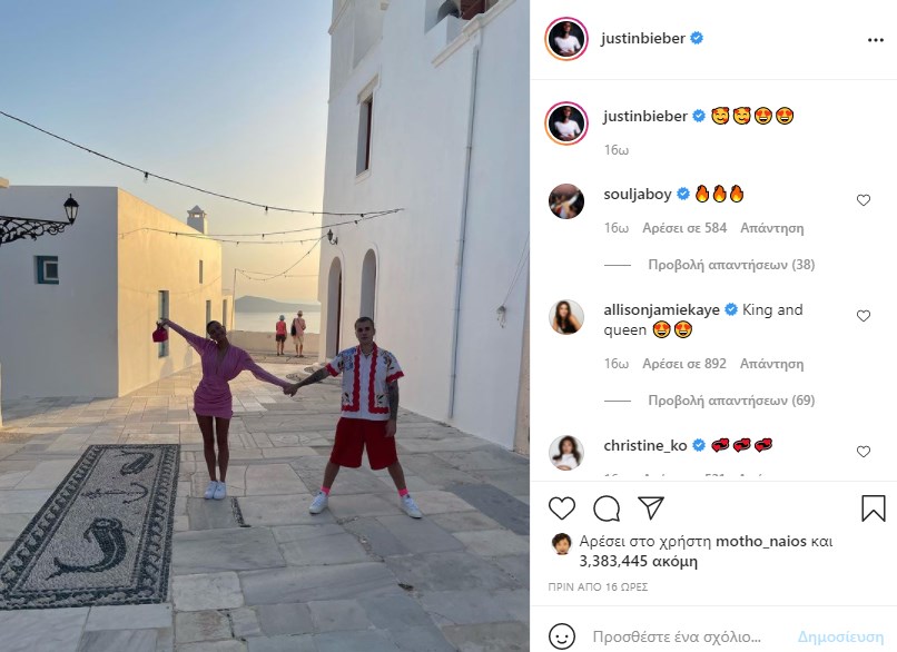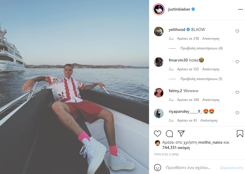 Αν και η κυρία Μπίμπερ δεν έχει δημοσιεύσει ακόμα φωτογραφίες από τις διακοπές του ζευγαριού στα ελληνικά νησιά, ο Τζάστιν φροντίζει να κρατά ενήμερους τους θαυμαστές του. Έτσι, ο διάσημος τραγουδιστής τα τελευταία 24ωρα έχει ανεβάσει στον λογαριασμό του αρκετά στιγμιότυπα από τις περιπέτειές τους στη Μήλο.