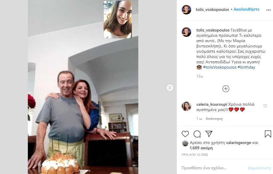 Τα γενέθλιά του γιόρτασε χθες ο Τόλης Βοσκόπουλος με την σύζυγό του, Άντζελα Γκερέκου στο πλευρό του. Ο διάσημος τραγουδιστής λόγω και της πανδημίας του κορονοϊού έσβησε τα κεράκια της τούρτας στο σπίτι, ενώ έκανε και βιντεοκλήση με την κόρη του. Ο Τόλης Βοσκόπουλος γεννήθηκε στις 26 Ιουλίου του 1940 και πλέον “έκλεισε” και… επίσημα τα 80 του έτη. Στον λογαριασμό του στο Instagram δημοσίευσε δύο φωτογραφίες με την λεζάντα «Γενέθλια με αγαπημένα πρόσωπα! Τι καλύτερο από αυτό.. (Με την Μαρία βιντεοκλήση).. Κι όσο μεγαλώνουμε γινόμαστε καλύτεροι! Σας ευχαριστώ πολύ όλους για τις υπέροχες ευχές σας! Ανταποδίδω! Υγεία κι αγάπη!» .