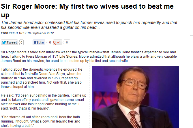 O μεγάλος ηθοποιός του Hollywood, Roger Moore, παραδέχτηκε στην Αμερικανική εκπομπή «Life Stories» ότι οι δύο πρώην γυναίκες του τον έδερναν και μάλιστα η δεύτερη του έσπασε μια κιθάρα στο κεφάλι του!Η πρώτη του σύζυγος, η Doorn van Steyn, την οποία παντρεύτηκε το 1946, σε έναν από τους καυγάδες τους, του πέταξε ένα τσαγιερό με καυτό τσάι. Ο γάμος τους κράτησε 7 χρόνια.Στη συνέχεια ο ηθοποιός παντρεύτηκε το 1953 την τραγουδίστρια Dorothy Squires, όπου και εκείνη δεν του φέρθηκε με τρυφερότητα. Κάποια στιγμή του πέρασε την κιθάρα καπέλο!