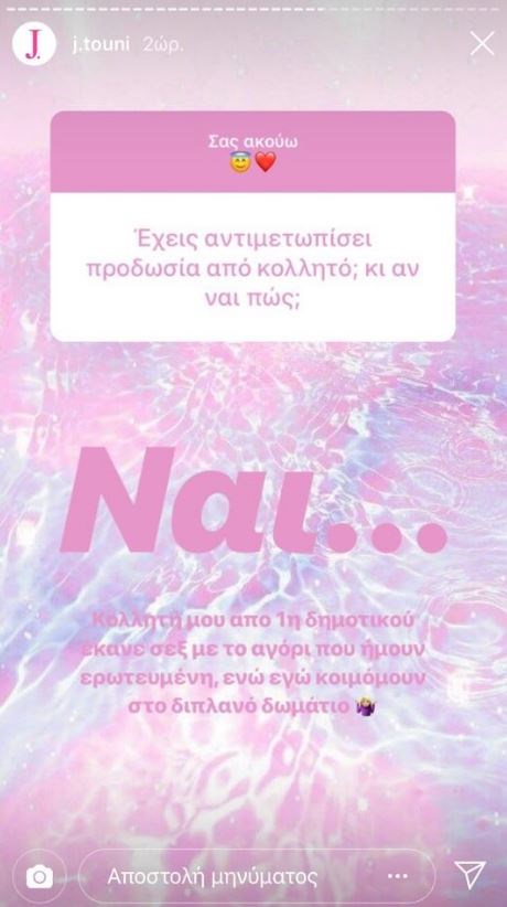 Η Ιωάννα Τούνη είναι ιδιαίτερα ενεργή στα social media και την Τρίτη προσκάλεσε τους followers που έχειστο Instagram να την ρωτήσουν ό,τι θέλουν.Μία από τις ερωτήσεις που κλήθηκε να απαντήσει ήταν αυτή «έχεις αντιμετωπίσει προδοσία από κολλητό; Κι αν ναι πως;» Η εκρηκτική ξανθιά δεν είχε κανένα πρόβλημα να απαντήσει και προχώρησε σε μία πολύ μεγάλη αποκάλυψη. «Ναι, κολλητή μου από την 1η δημοτικού έκανε σεξ με το αγόρι που ήμουν ερωτευμένη, ενώ εγώ κοιμόμουν στο διπλανό δωμάτιο».Δείτε τη φωτογραφία