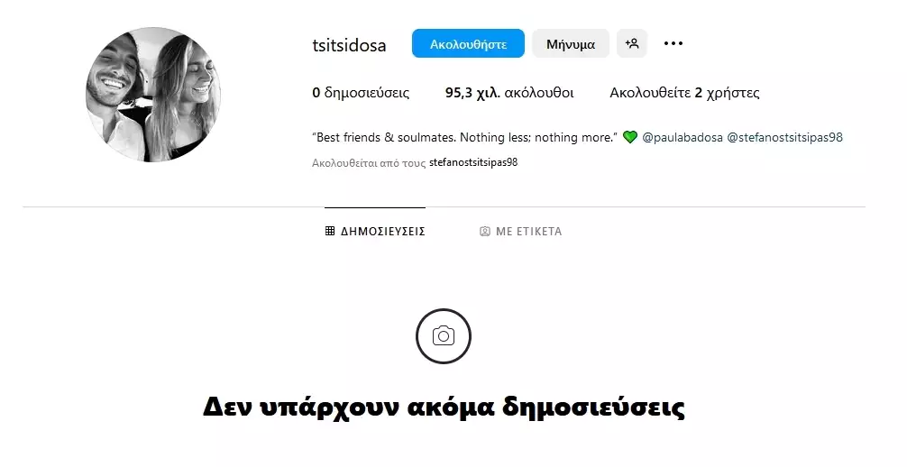 Μάλιστα οι δύο τενίστες έχουν δημιουργήσει και ένα κοινό προφίλ στο instagram με το όνομα «tsitsidosa», στο οποίο και είχαν ανεβάσει κοινές τους φωτογραφίες εκφράζοντας την αγάπη που τρέφει ο ένας για τον άλλον. Όμως τις τελευταίες ώρες διέγραψαν όλες τις κοινές τους φωτογραφίες που είχαν κοινοποιήσει στο «tsitsidosa» προφίλ, προκαλώντας απορίες για την κίνησή τους.