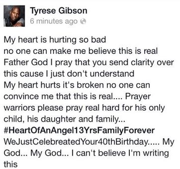 «Η καρδιά μου πονάει τόσο πολύ, κανείς δεν μπορεί να με κάνει να πιστέψω ότι αυτό είναι αληθινό. Πατέρα Θεέ, προσεύχομαι να δώσεις φως στην αιτία. Απλώς δε μπορώ να καταλάβω. Η καρδιά μου πονάει, πάει να σπάσει. Κανείς δεν μπορεί να με πείσει ότι αυτό είναι πραγματικό. Προσευχηθείτε δυνατά για το μοναχοπαίδι του και την οικογένειά του», έγραψε ο Tyrese Gibson.