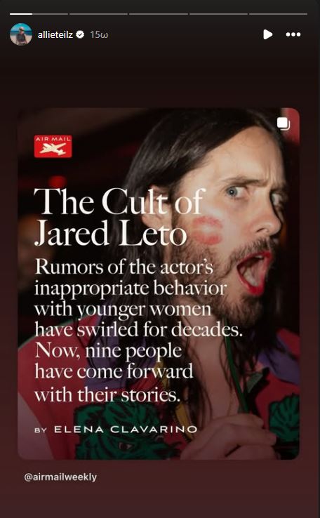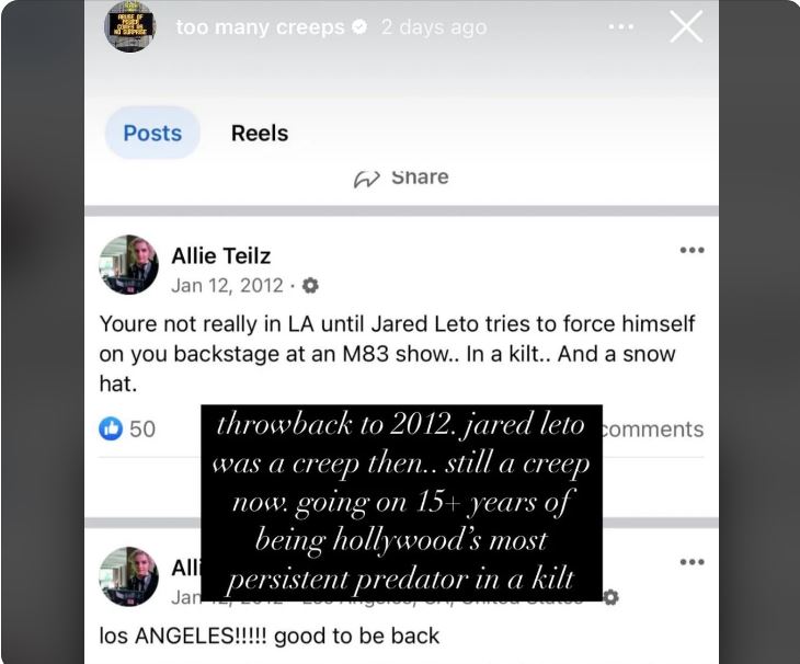 Μεταξύ των επώνυμων καταγγελιών ξεχωρίζει αυτή της DJ Allie Teilz, η οποία είχε δημοσιεύσει ήδη από το 2012 ανάρτηση σε μέσο κοινωνικής δικτύωσης, γράφοντας: «Δεν είσαι πραγματικά στο Λος Άντζελες μέχρι να προσπαθήσει ο Τζάρεντ Λέτο να σου την πέσει στα παρασκήνια». Σε νεότερη ανάρτησή της στο Instagram, που επικαλείται το Air Mail, η Teilz ανέφερε πως «κακοποιήθηκε και τραυματίστηκε» από τον Λέτο όταν ήταν 17 ετών, προσθέτοντας ότι εκείνος «γνώριζε την ηλικία της και δεν τον ένοιαζε». Ο εκπρόσωπος του ηθοποιού χαρακτήρισε τις καταγγελίες της «κατάφωρα ψευδείς».