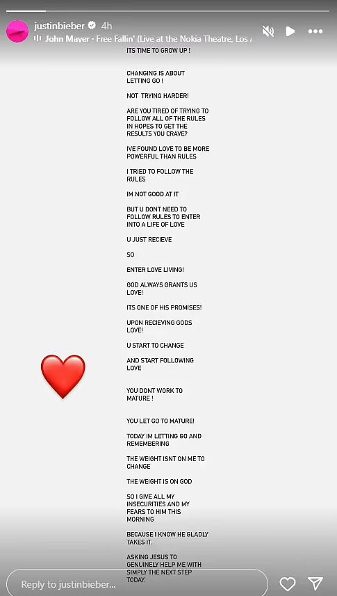 Το μήνυμά του προς τον Θεό ξεκινούσε με τα λόγια: «Είναι ώρα να μεγαλώσεις! Η αλλαγή σημαίνει να αφήνεις [κάτι] πίσω! Όχι να προσπαθείς περισσότερο! Είσαι κουρασμένος από το να προσπαθείς να ακολουθείς όλους τους κανόνες ελπίζοντας ότι θα πάρεις τα αποτελέσματα που επιθυμείς; Εγώ βρήκα την αγάπη πιο δυνατή από τους κανόνες που προσπάθησα να ακολουθήσω».