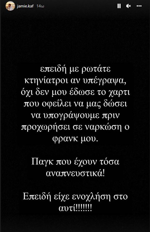 Ο Τζέιμς Καφετζής αποχαιρέτησε το αγαπημένο του κατοικίδιο μέσα από τον λογαριασμό του στο Instagram γράφοντας χαρακτηριστικά: “Ευχαριστώ πολύ την ‘γιατρό’ που έδωσε λάθος δοσολογία ηρεμιστικού στον Φρανκ μου και τον σκότωσε, ενώ πήγε για μια ενόχληση στο αυτί”.