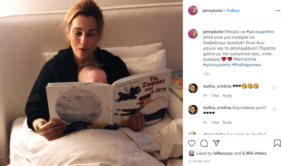 “Μπορεί να #μένουμεσπίτι αλλά είναι μια ευκαιρία να διαβάζουμε αγκαλιά!! Είναι 4ων μηνών και το απολαμβάνει!! Περάστε χρόνο με την οικογένεια σας… είναι ευκαιρία” έγραψε η ηθοποιός Τζένη Μπότση στον λογαριασμό της στο instagram. Η ηθοποιός συγκέντρωσε εκατοντάδες likes για την τρυφερή φωτογραφία που κρατά στην αγκαλιά της την κόρη της ενώ της διαβάζει ένα παραμύθι.