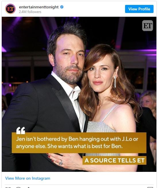 Από την άλλη μεριά, η πρώην σύζυγος του Μπεν Άφλεκ, Τζένιφερ Γκάρνερ, φαίνεται να μην έχει κανένα απολύτως πρόβλημα με αυτές τις συναντήσεις, σύμφωνα με έρευνα του Entertainment Tonight, καθώς η ίδια θέλει το καλύτερο για τον Άφλεκ.