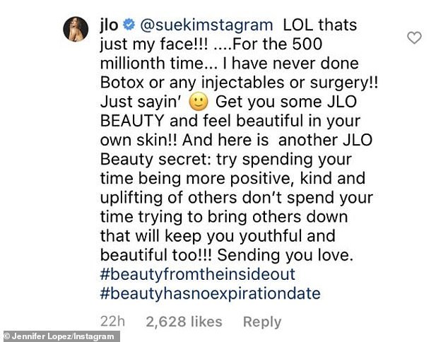 Η Λατίνα σούπερ στάρ δεν έχασε την ευκαιρία να δώσει την απάντησή της τονίζοντας ότι δεν έχει κάνει ποτέ μπότοξ ή κάποια επέμβαση και προέτρεψε τον χρήστη του instagram να “έχεις πιο θετική στάση στη ζωή” και να “μην καταναλώνεις τον χρόνο σου προσπαθώντας να ρίξεις ψυχολογικά τους άλλους”.
