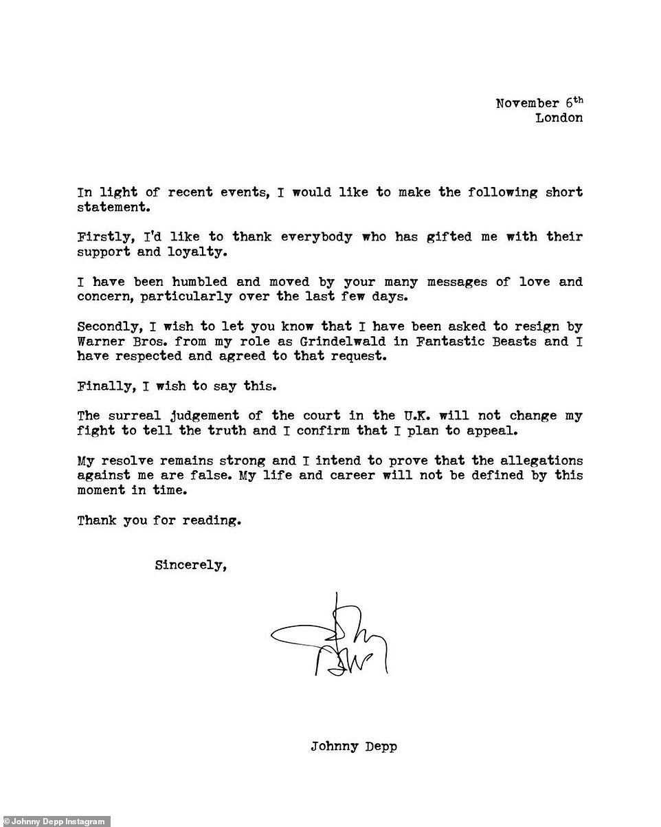 Δευτερευόντως, θα ήθελα να σας ενημερώσω ότι μου ζήτησαν να παραιτηθώ από τη Warner Bros. και τον ρόλο μου ως Γκρίντελβαλντ στα “Fantastic Beasts” και το σεβάστηκα αυτό και συμφώνησα με αυτό το αίτημα. Τέλος, θα ήθελα να πω αυτό. Η σουρεαλιστική απόφαση του δικαστηρίου στη Μεγάλη Βρετανία δεν θα μου αλλάξει τον αγώνα να πω την αλήθεια και επιβεβαιώνω ότι σχεδιάζω να κάνω έφεση. Η αποφασιστικότητά μου παραμένει ισχυρή και σκοπεύω να αποδείξω ότι οι ισχυρισμοί εναντίον μου είναι ψευδείς. Η ζωή και η καριέρα μου δεν θα καθοριστούν από αυτήν τη στιγμή. Ευχαριστώ που διαβάσατε. Με εκτίμηση Τζόνι Ντεπ”.