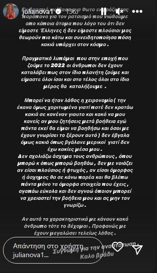 Δεν σχολιάζω άσχημα τους ανθρώπους, όπου μπορώ και όπως μπορώ βοηθάω, δεν με νοιάζει αν είσαι πλούσιος ή φτωχός, αν είσαι όμορφος ή άσχημος, θα σε κάνω παρέα και θα βλέπω πάντα μόνο τα όμορφα στοιχεία που έχεις, αγαπώ εύκολα και δεν αγνοώ όποιον μπορεί να χρειαστεί τη βοήθειά μου και ας μην τον γνωρίζω. Αν αυτά τα χαρακτηριστικά με κάνουν κακό άνθρωπο, τότε το δέχομαι. Προφανώς με έχουν μεγαλώσει τελείως λάθος. Συγγνώμη για την αναστάτωση» έγραψε η Τζούλια Νόβα στο Instagram.