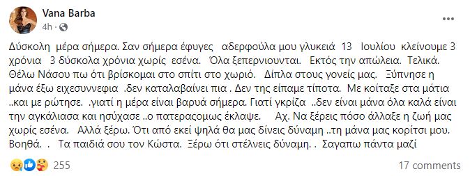 Ακολουθεί η δημοσίευση που έκανε η Βάνα Μπάρμπα