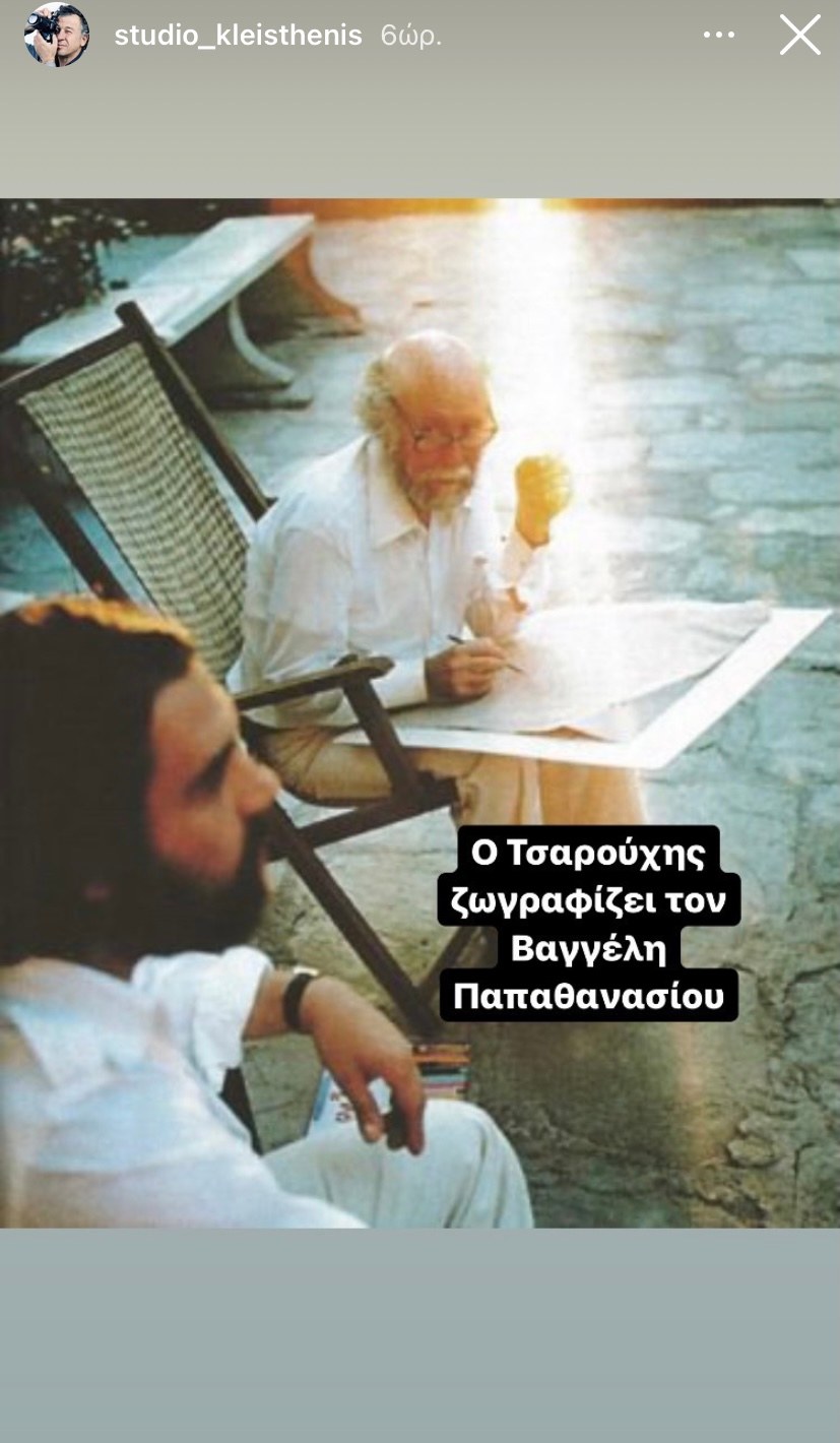 Στη δημοσίευση αναγράφεται: “Ο Τσαρούχης ζωγραφίζει τον Βαγγέλη Παπαθανασίου”.