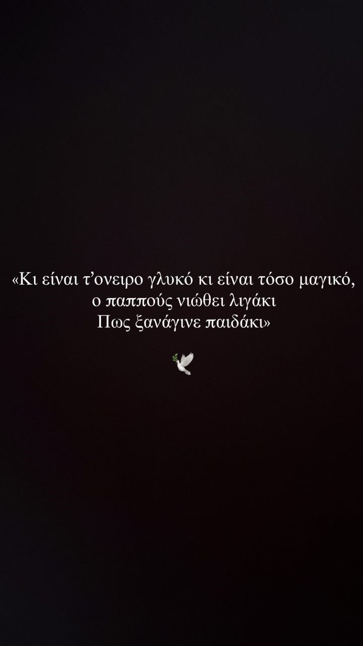 Λίγο αργότερα ανέβασε άλλο ένα Instagram story με μαύρο φόντο όπου έγραφε: «Κι είναι τ’ όνειρο γλυκό, και είναι τόσο μαγικό, ο παππούς νιώθει λιγάκι πως ξανάγινε παιδάκι”.