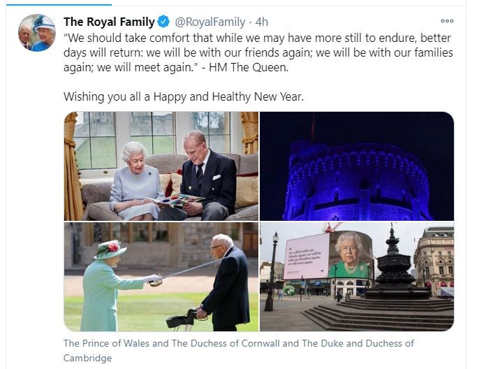 Με αισιοδοξία ατενίζει το νέο έτος η βασίλισσα Ελισάβετ και αυτό αντανακλάται στο πρωτοχρονιάτικο μήνυμά της που απηύθυνε στους πολίτες του Ηνωμένου Βασιλείου και της Κοινοπολιτείας. Διαβεβαίωσε τη χώρα ότι καλύτερες μέρες θα επιστρέψουν και πως θα συναντηθούμε ξανά. Επανέλαβε τα λόγια που πρώτα είχε πει στο τηλεοπτικό μήνυμά της στις 5 Απριλίου λίγο μετά το ξέσπασμα της πανδημίας. Σε ανάρτησή της στο twitter ευχήθηκε χαρούμενο και υγιές νέο έτος.