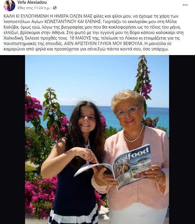 “Καλή κι ευλογημένη η ημέρα όλων μας φίλες και φίλοι μου, να έχουμε τη χάρη των Ισαποστόλων Αγίων ΚΩΝΣΤΑΝΤΙΝΟΥ ΚΑΙ ΕΛΕΝΗΣ. Γιορτάζει το εκκλησάκι μου στη Μόλα Καλύβα, όμως εγώ, λόγω της βιογραφίας μου που θα κυκλοφορήσει ως το τέλος του μήνα, ελπίζω!, βρίσκομαι στην Αθήνα. Στη φωτό με την εγγονή μου τη Βέφα κάποιο καλοκαίρι στη Χαλκιδική. Έκλεισε προχθές τους 18 ΜΑΙΟΥΣ της, τελείωσε το Λύκειο κι ετοιμάζεται για τις πανεπιστημιακές της σπουδές. ΑΙΕΝ ΑΡΙΣΤΕΥΕΙΝ ΓΛΥΚΙΆ ΜΟΥ ΒΕΦΟΥΛΑ. Η μανούλα σε καμαρώνει από ψηλά και προσεύχεται για σένα. Εγώ πάντα κοντά σου, όσο υπάρχω”, έγραψε στην ανάρτησή της.