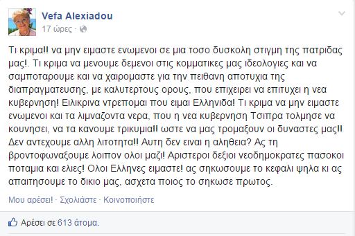 Η Βέφα Αλεξιάδου έγραψε μεταξύ άλλων στο λογαριασμό της: «Τι κρίμα! Να μην είμαστε ενωμένοι σε μια τόσο δύσκολη στιγμή της πατρίδας μας! Τι κρίμα να μένουμε δεμένοι στις κομματικές ιδεολογίες και να σαμποτάρουμε και να χαιρόμαστε για την πιθανή αποτυχία της διαπραγμάτευσης με καλύτερους όρους που επιχειρεί να επιτύχει η νέα κυβέρνηση. Ειλικρινά ντρέπομαι που είμαι Ελληνίδα! Τι κρίμα να μην είμαστε ενωμένοι και τα λιμνάζοντα νερά που η νέα Κυβέρνηση τόλμησε να κουνήσει να τα κάνουμε τρικυμία ώστε να μας τρομάξουν οι δυνάστες μας! Δεν αντέχουμε άλλη λιτότητα! Αυτή δεν είναι η αλήθεια; Ας τη βροντοφωνάξουμε λοιπόν όλοι μαζί! Αριστεροί, δεξιού νεοδημοκράτες, πασόκοι, ποτάμια και ελιές. Όλοι Έλληνες είμαστε! Ας σηκώσουμε το κεφάλι ψηλά κι ας απαιτήσουμε το δίκιο μας άσχετα ποιος το σήκωσε πρώτος».