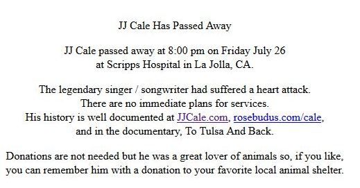O θρύλος της μουσικής ροκ σκηνής, ο JJ Cale άφησε την τελευταία του πνοή, την Παρασκευή στο νοσοκομείο Λα Χόγια, στην Καλιφόρνια, προδομένος από την καρδιά του, σε ηλικία 74 ετών.