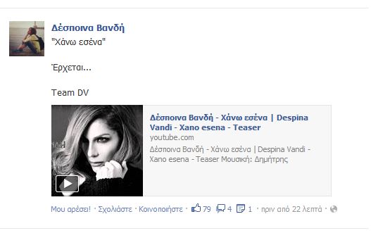 Η Δέσποινα Βανδή ανέβασε στον προσωπικό της λογαρισμό στο facebook ένα απόσπασμα από το νέο της τραγούδι με τίτλο “Χάνω Εσένα”.