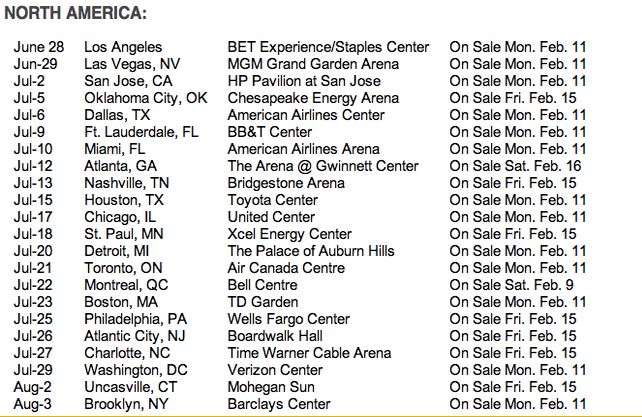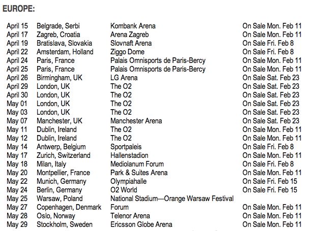 H περιοδεία ξεκινάει από τις χώρες της Ευρώπης στις 15 Απριλίου, ενώ από τις 28 Ιουνίου θα τραγουδήσει στην Αυστραλία, στη Λατινική Αμερική και στην Ασία.