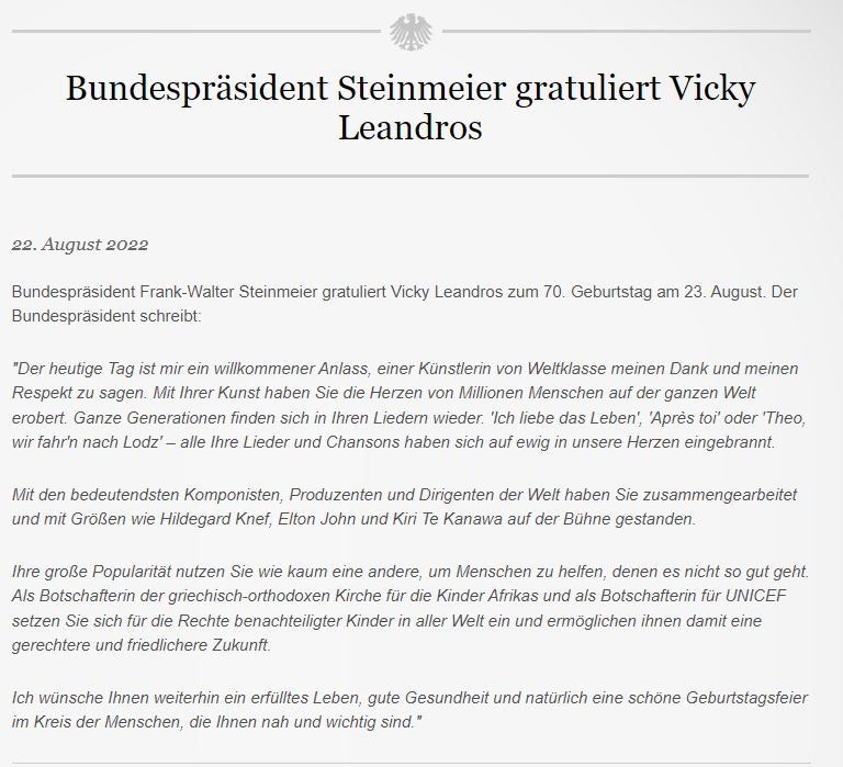 Σε μια ασυνήθιστη κίνηση προχώρησε η Γερμανική Προεδρία δείχνοντας παράλληλα την αναγνώριση και το σεβασμό της σε μια Ελληνίδα. Συγκεκριμένα με επίσημη ανάρτηση στην ιστοσελίδα της γερμανικής Προεδρίας και ένα ιδιαίτερα κολακευτικό κείμενο, ο πρόεδρος της χώρας Φρανκ Βάλτερ Στάινμαγερ ευχήθηκε στη διεθνούς φήμης Ελληνίδα καλλιτέχνη Βίκυ Λέανδρος «χρόνια πολλά» για τα 70α γενέθλια της!